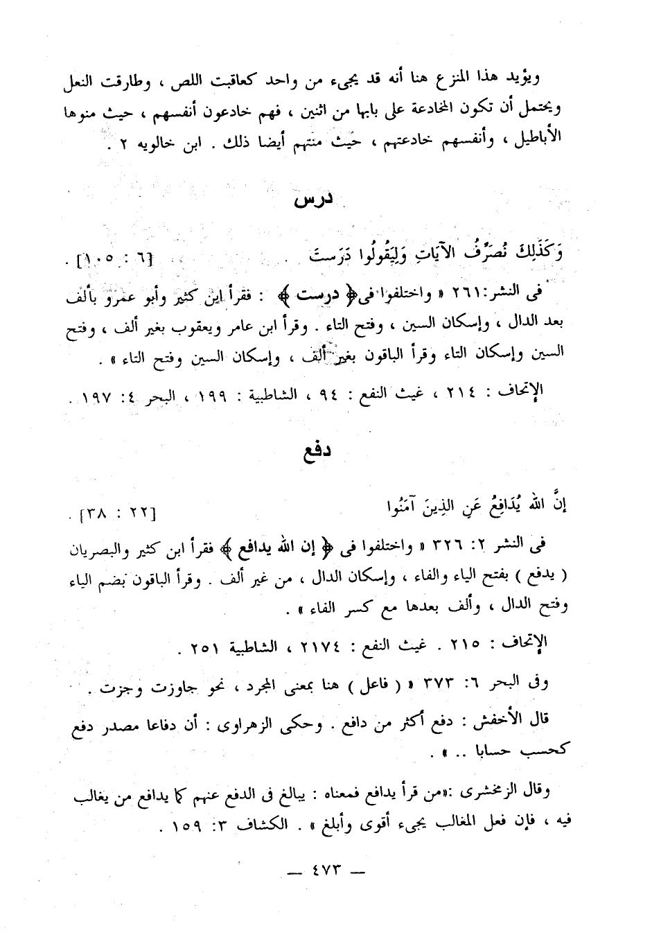 في النشر 2: 326: «واختلفوا في {إن الله يدافع} فقرأ ابن كثير والبصريان (يدفع) بفتح الياء والفاء، وإسكان الدال، من غير ألف. وقرأ الباقون بضم الياء وفتح الدال، وألف بعدها مع كسر الفاء».