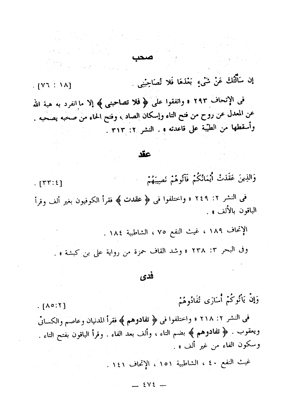في الإتحاف 293: «واتفقوا على {فلا تصاحبني} إلا ما انفرد به هبة الله عن المعدل عن روح من فتح التاء وإسكان الصاد، وفتح الحاء من صحبه يصحبه. وأسقطها من الطيبة على قاعدته». النشر 2: 313.