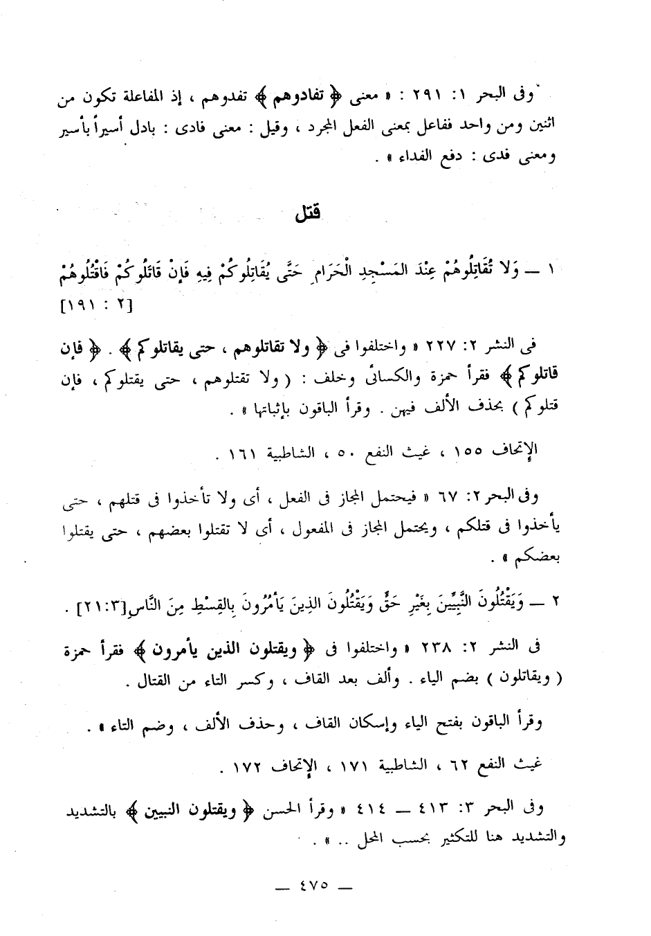 وفي البحر 2: 67: «فيحتمل المجاز في الفعل، أي ولا تأخذوا في قتلهم، حتى يأخذوا في قتلكم، ويحتمل المجاز في المفعول، أي لا تقتلوا بعضهم، حتى يقتلوا بعضكم».
