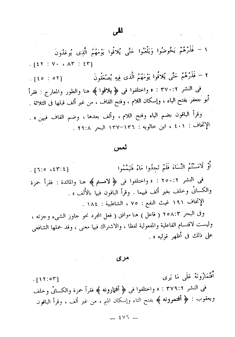 في النشر 2: 379: «واختلفوا في {أفتمارونه} فقرأ حمزة والكسائي وخلف ويعقوب: {أفتمرونه} بفتح التاء وإسكان الميم، من غير ألف، وقرأ الباقون
