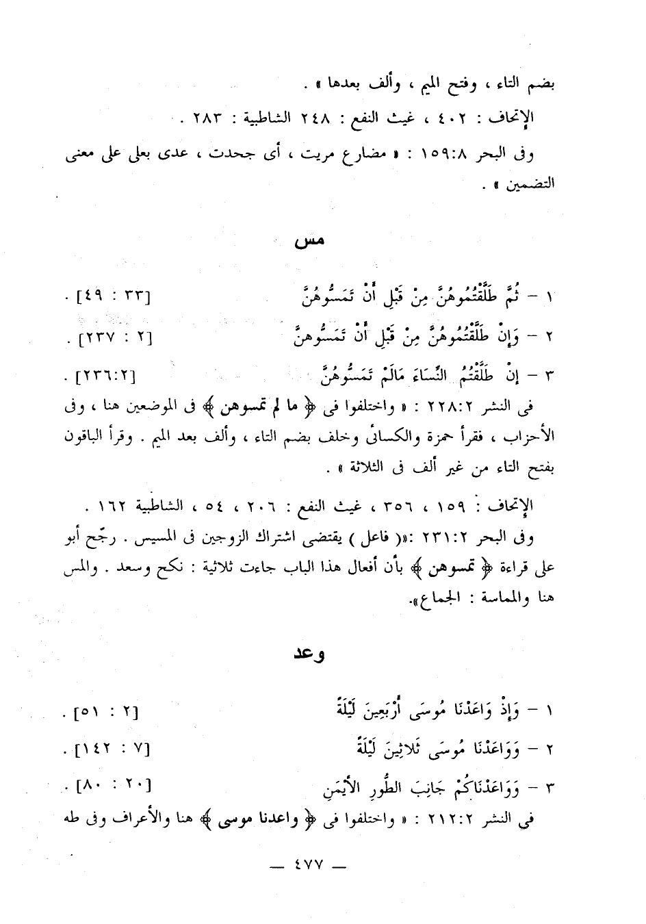 وفي البحر 2: 231: «(فاعل) يقتضي اشتراك الزوجين في المسيس. رجح أبو علي قراءة {تمسوهن} بأن أفعال هذا الباب جاءت ثلاثية: نكح وسعد. والمس هنا والمماسة: الجماع».