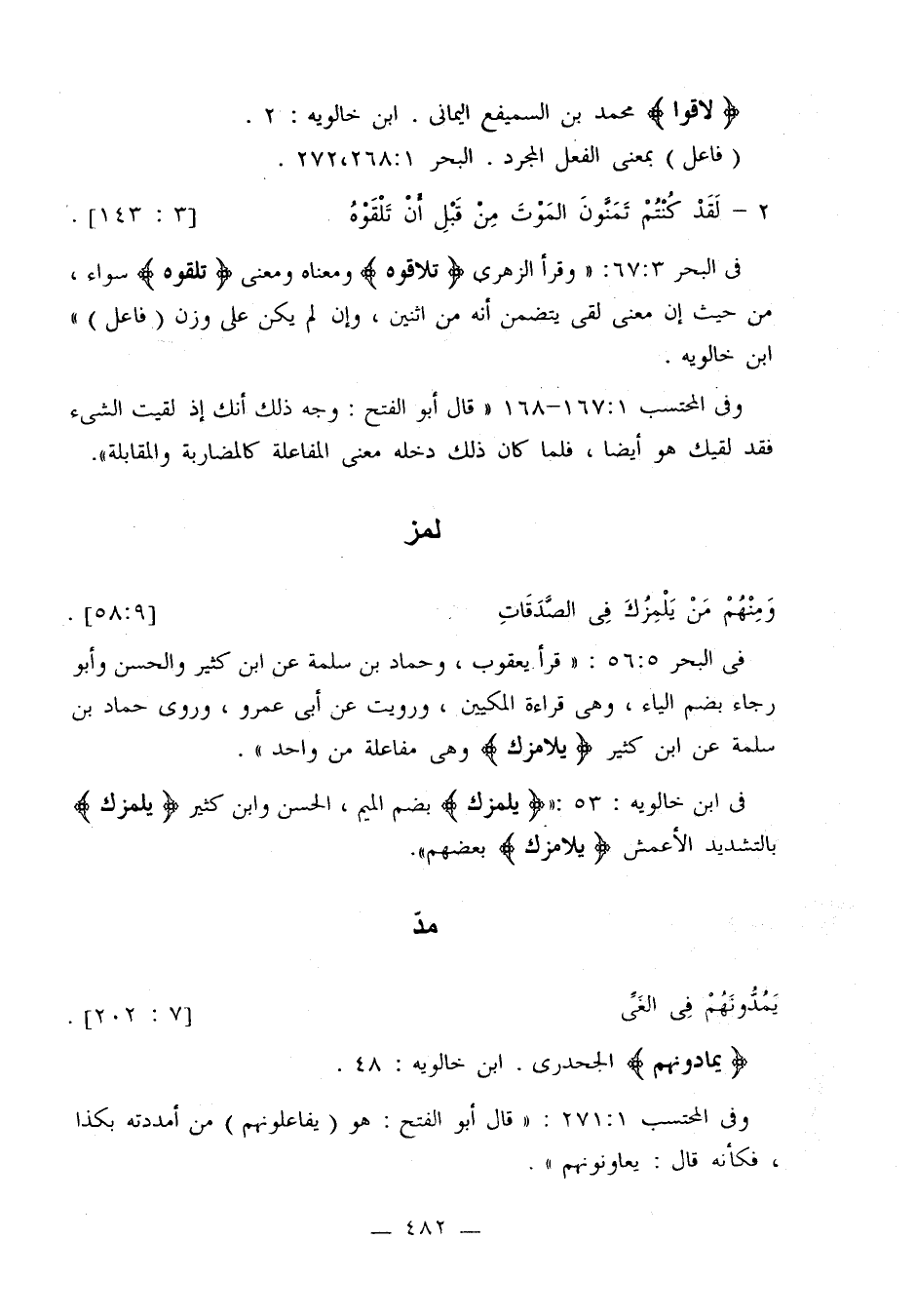 في البحر 3: 67: «وقرأ الزهري {تلاقوه} ومعناه ومعنى {تلقوه} سواء، من حيث إن معنى لقى يتضمن أنه من اثنين، وإن لم يكن على وزن (فاعل)». ابن خالويه.