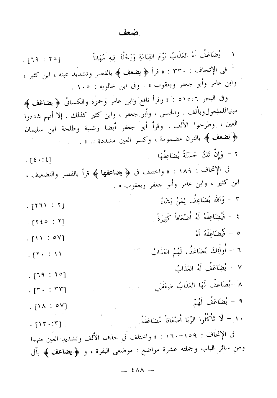 في الإتحاف: 159 - 160: «واختلف في حذف الألف وتشديد العين منهما ومن سائر الباب وجملته عشرة مواضع: موضعي البقرة، و {يضاعف} بآل