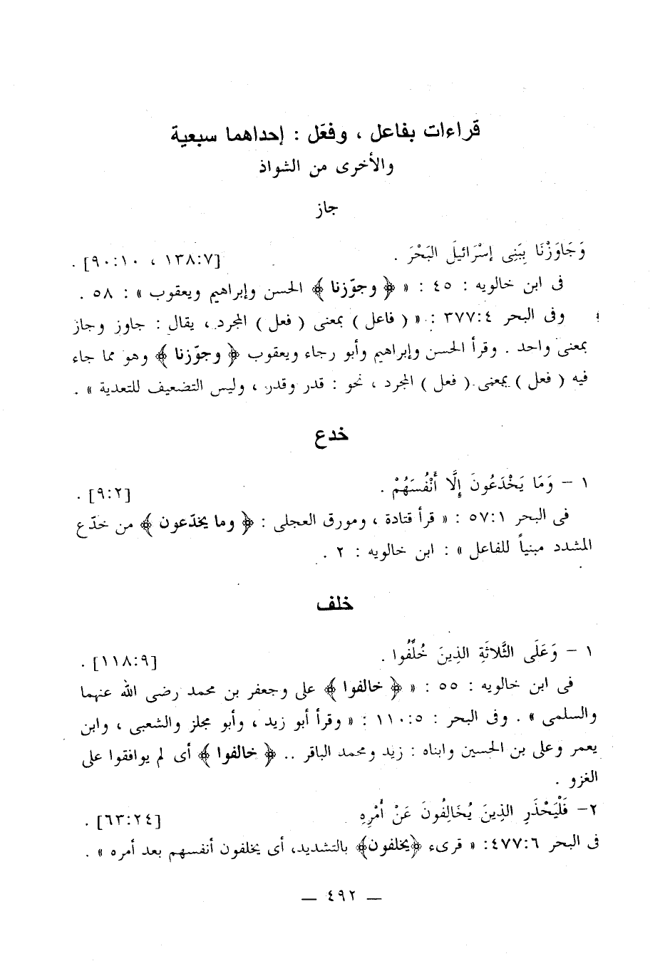 في ابن خالويه: 55: «{خالفوا} علي وجعفر بن محمد رضي الله عنهما والسلمي». وفي البحر: 5: 110: «وقرأ أبو ريد، وأبو مجلز والشعبي، وابن يعمر وعلي بن الحسين وابناه: زيد ومحمد الباقر. {خالفوا} أي لم يوافقوا على الغزو».