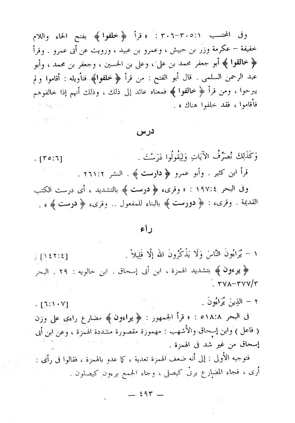 في البحر 8: 518: «قرأ الجمهور: {يراءون} مضارع راءى على وزن (فاعل) وابن إسحاق والأشهب: مهموزة مقصورة مشددة الهمزة، وعن ابن أبي إسحاق من غير شد في الهمزة.