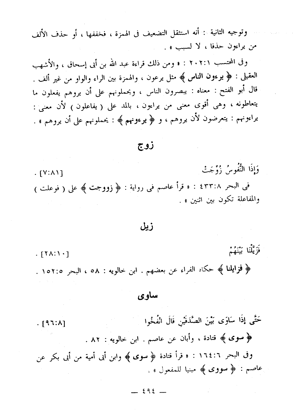 وفي البحر 6: 164: «قرأ قتادة {سوى} وابن أبي أمية من أبي بكر عن عاصم: {سووى} مبنيا للمفعول».