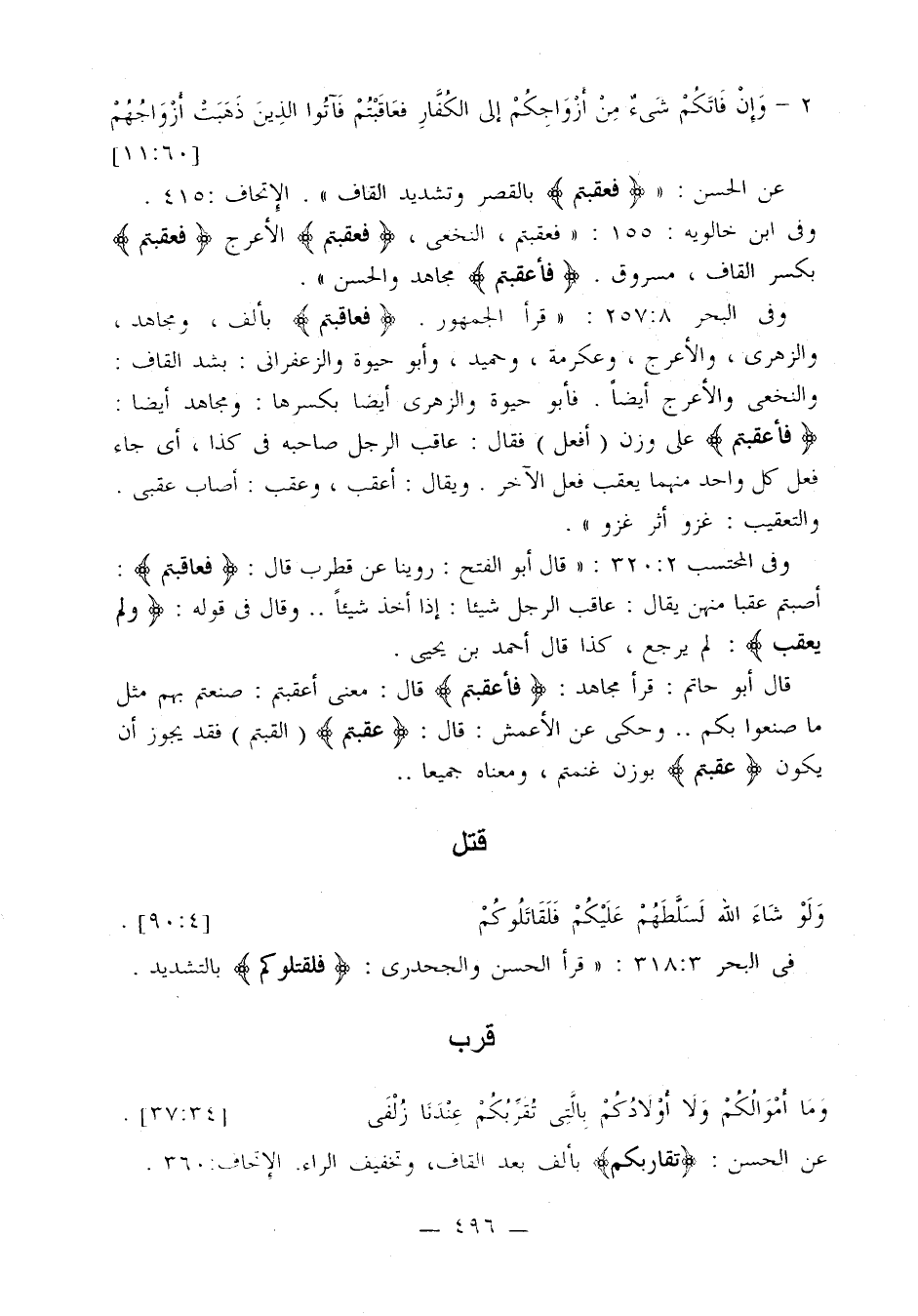وفي ابن خالويه: 155: «فعقبتم، النخعي، {فعقبتم} الأعرج {فعقبتم} بكسر القاف، مسروق. {فأعقبتم} مجاهد والحسن».