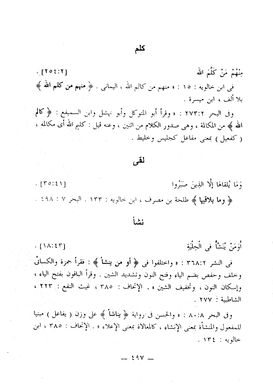 وفي البحر 8: 80: «والحسن في رواية {يناشأ} على وزن (يفاعل) مبنيا للمفعول والمنشأة بمعنى الإنشاء، كالمعالاة بمعنى الإعلاء». الإتحاف: 385، ابن خالويه: 134.