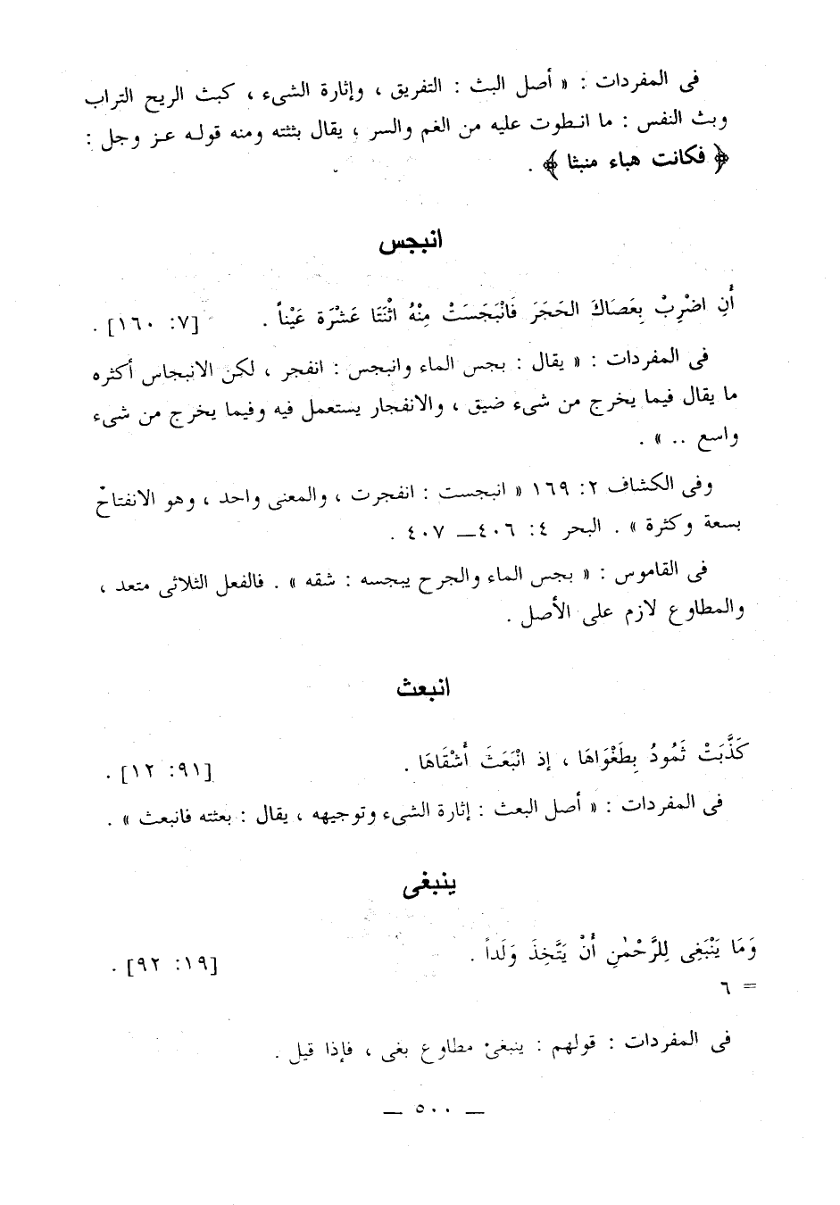 وفي الكشاف 2: 196: «انبجست: انفجرت، والمعنى واحد، وهو الانفتاح بسعة وكثرة». البحر 4: 406 - 407.