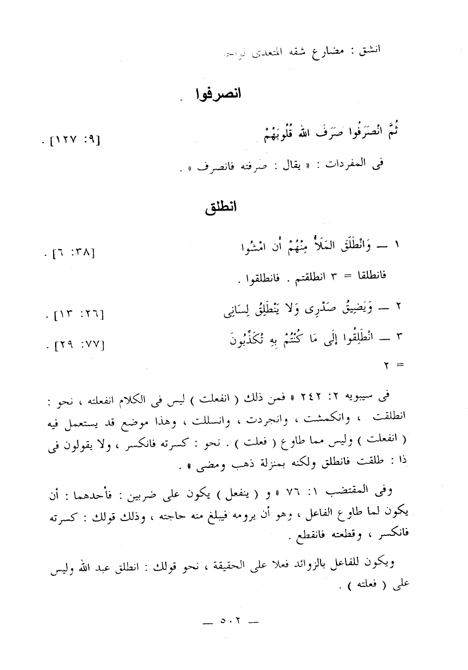 في سيبويه 2: 242: «فمن ذلك (انفعلت) ليس في الكلام انفعلته، نحو: انطلقت، وانكمشت، وانجردت، وانسللت، وهذا موضع قد يستعمل فيه (انفعلت) وليس مما طاوع (فعلت). نحو: كسرته فانكسر، ولا يقولون في ذا: طلقت فانطلق ولكنه بمنزلة ذهب ومضى».