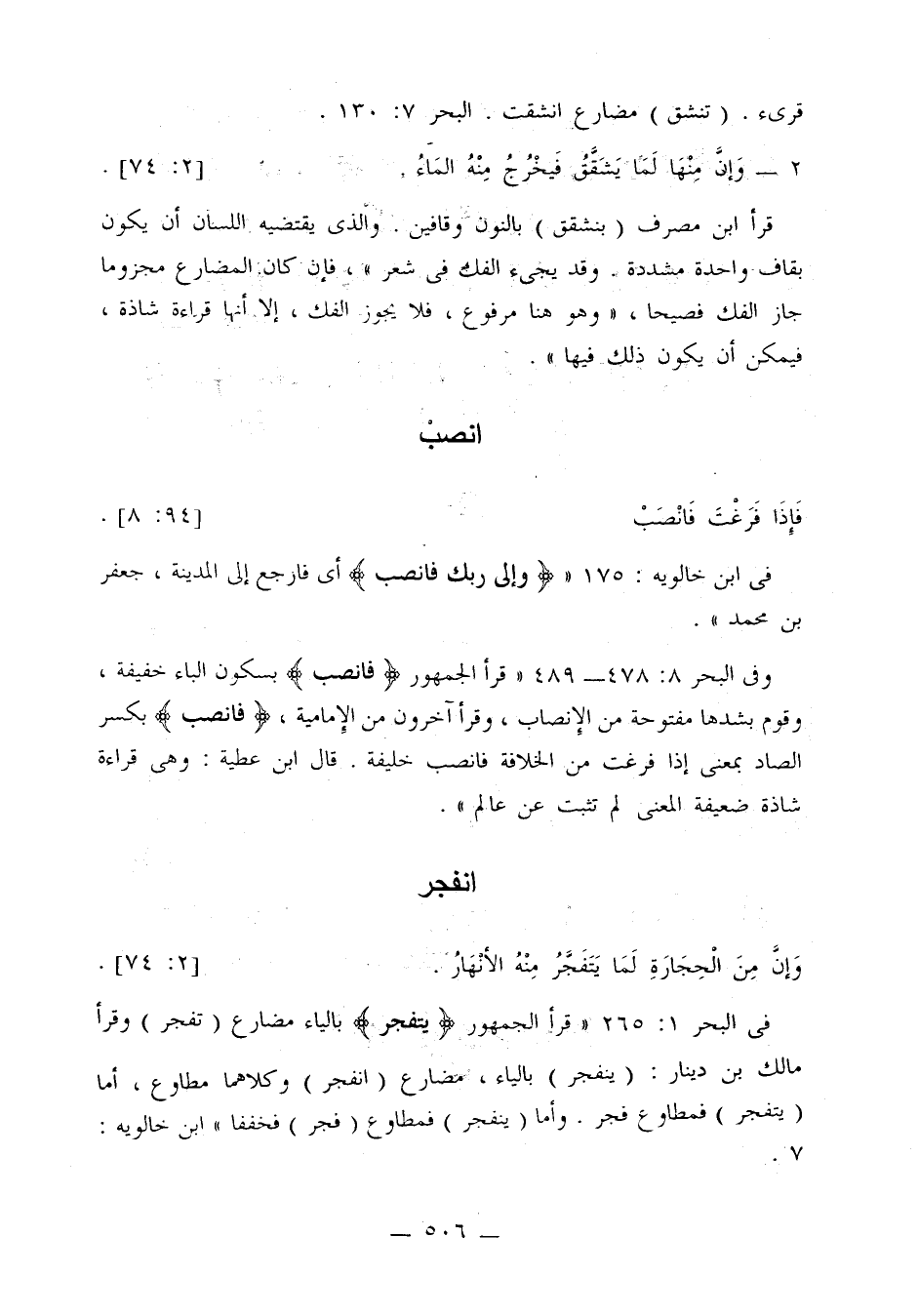 في البحر 1: 265: «قرأ الجمهور {يتفجر} بالياء مضارع (تفجر) وقرأ مالك بن دينار: (ينفجر) بالياء، مضارع (انفجر) وكلاهما مطاوع، أما (يتفجر) فمطاوع فجر. وأما (ينفجر) فمطاوع (فجر) فخففنا». ابن خالويه: 7.