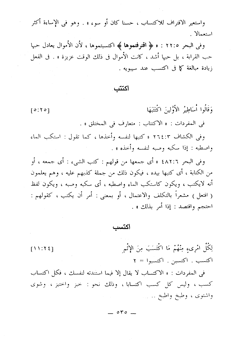 وفي البحر 5: 22: «{اقترفتموها} اكتسبتموها، لأن الأموال يعادل حبها حب القرابة، بل حبها أشد، كانت الأموال في ذلك الوقت عزيزة». في الفعل زيادة مبالغة كما في اكتسب عند سيبويه.