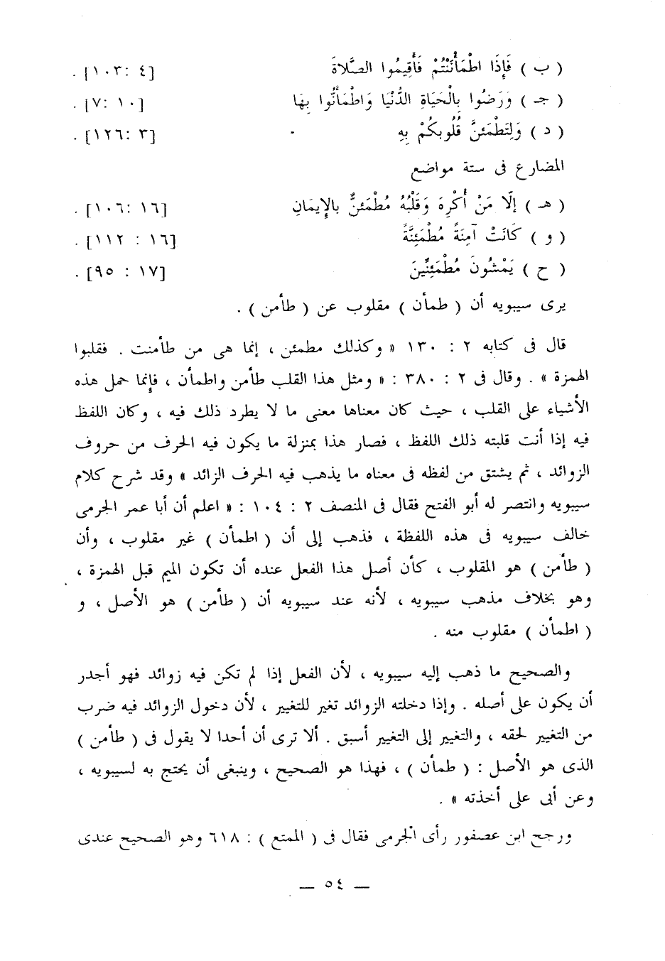 قال في كتابه 2: 130: «وكذلك مطمئن، إنما هي من طأمنت. فقلبوا الهمزة». وقال في 2: 380: «ومثل هذا القلب طأمن واطمأن، فإنما حمل هذه الأشياء على القلب، حيث كان معناها معنى ما لا يطرد ذلك فيه، وكان اللفظ فيه إذا أنت قلبته ذلك اللفظ، فصار هذا بمنزلة ما يكون فيه الحرف من حروف الزوائد، ثم يشتق من لفظه في معناه ما يذهب فيه الحرف الزائد». وقد شرح كلام سيبويه وانتصر له أبو الفتح فقال في المنصف 2: 104: «اعلم أن أبا عمر الجرمي خالف سيبويه في هذه اللفظة، فذهب إلى أن (اطمأن) غير مقلوب، وأن (طأمن) هو المقلوب، كأن أصل هذا الفعل عنده أن تكون الميم قبل الهمزة، وهو بخلاف مذهب سيبويه، لأنه عند سيبويه أن (طأمن) هو الأصل، و (اطمأن) مقلوب منه.