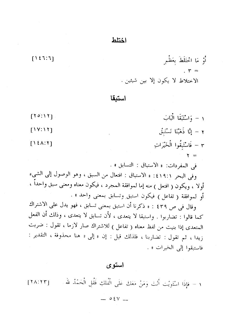وفي البحر 1: 419: «الاستباق: افتعال من السبق، وهو الوصول إلى الشيء أولاً، ويكون (افتعل) منه إما لموافقة المجرد، فيكون معناه ومعنى سبق واحدًا، أو لموافقة (تفاعل) فيكون استبق وتسابق بمعنى واحد».