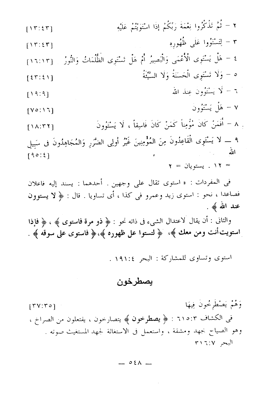 في المفردات: «استوى تقال على وجهين. أحدهما: يسند إليه فاعلان فصاعدا، نحو: استوى زيد وعمرو في كذا، أي تساويا. قال: {لا يستوون عند الله}.