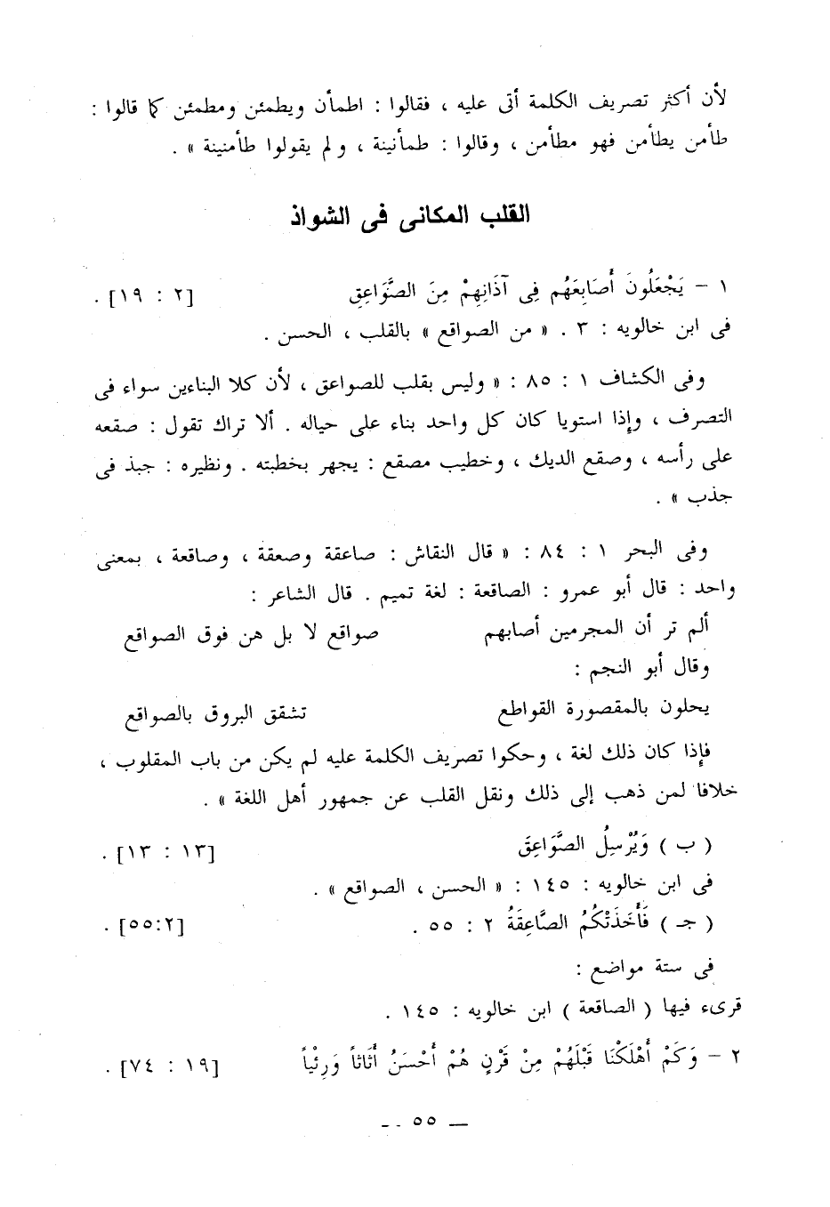 وفي الكشاف 1: 85: «وليس بقلب للصواعق، لأن كلا البناءين سواء في التصرف، وإذا استويا كان كل واحد بناء على حياله ألا تراك تقول: صقعه على رأسه، وصقع الديك، وخطيب مصقع: يجهر بخطبته. ونظيره: جبذ في جذب».