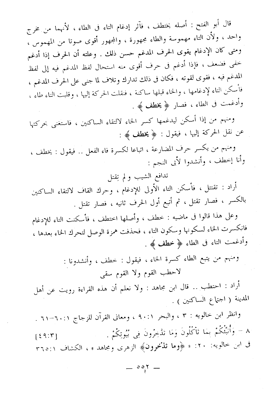 قال أبو الفتح: أصله يختطف، فآثر إدغام التاء في الطاء، لأنهما من مخرج واحد، ولأن التاء مهموسة والطاء مجهورة، والمجهور أقوى صوتا من المهموس، ومتى كان الإدغام يقوى الحرف المدغم حسن ذلك. وعلته أن الحرف إذا أدغم خفى فضعف، فإذا أدغم في حرف أقوى منه استحال لفظ المدغم فيه إلى لفظ المدغم فيه، فقوى لقوته، فكان في ذلك تدارك وتلاف لما جنى على الحرف المدغم، فأسكن التاء لإدغامها، والخاء قبلها ساكنة، فنقلت الحركة إليها، وقلبت التاء طاء، وأدغمت في الطاء، فصار {يخطف}.