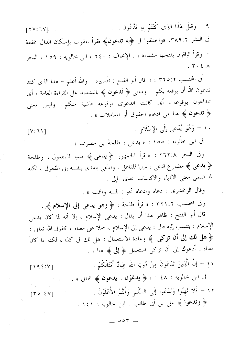 وفي البحر 8: 262: «قرأ الجمهور {يدعى} مبنيا للمفعول، وطلحة {يدعى} مضارع ادعى، مبنيا للفاعل. وادعى يتعدى بنفسه إلى المفعول، لكنه لما ضمن معنى الانتماء والانتساب عدى بإلى.