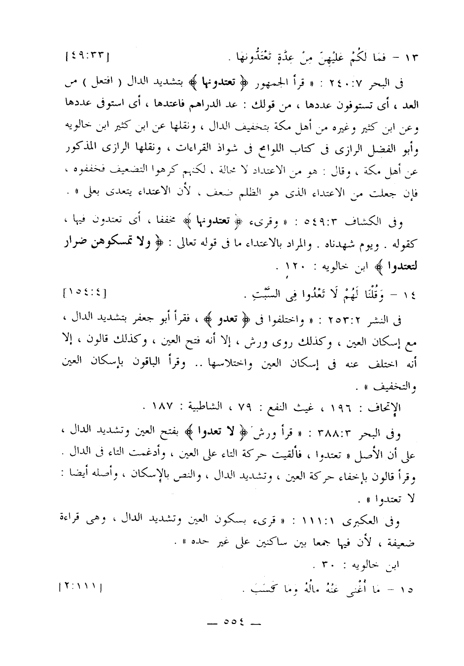 في البحر 7: 240: «قرأ الجمهور {تعتدونها} بتشديد الدال (افتعل) من العد، أي تستوفون عددها، من قولك: عد الدراهم فاعتدها، أي استوفى عددها وعن ابن كثير وغيره من أهل مكة بتخفيف الدال، ونقلها عن ابن كثير ابن خالويه وأبو الفضل الرازي في كتاب اللوامح في شواذ القراءات، ونقلها الرازي المذكور عن أهل مكة، وقال: هو من الاعتداد لا محالة، لكنهم كرهوا التضعيف فخففوه، فإن جعلت من الاعتداء الذي هو الظلم ضعف، لأن الاعتداء يتعدى بعلى».