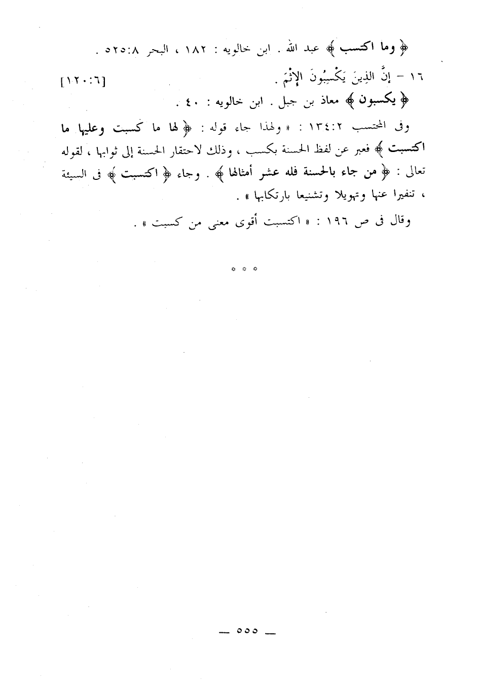 وفي المحتسب 2: 134: «ولهذا جاء قوله: {لها ما كسبت وعليها ما اكتسبت} فعبر عن لفظ الحسنة بكسب، وذلك لاحتقار الحسنة إلى ثوابها، لقوله تعالى: {من جاء بالحسنة فله عشر أمثالها}. وجاء {اكتسبت} في السيئة، تنفيرًا عنها وتهويلاً وتشنيعا بارتكابها».