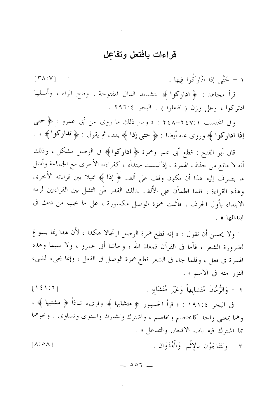 وفي المحتسب 1: 247 - 248: «ومن ذلك ما روى عن أبي عمرو: {حتى إذا اداركوا} وروى عنه أيضًا: {حتى إذا} يقف ثم يقول: {تداركوا}».