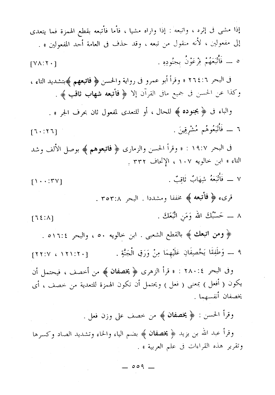 في البحر 6: 264: «وقرأ أبو عمرو في رواية والحسن {فاتبعهم} بتشديد التاء، وكذا عن الحسن في جميع ما في القرآن إلا {فأتبعه شهاب ثاقب}.