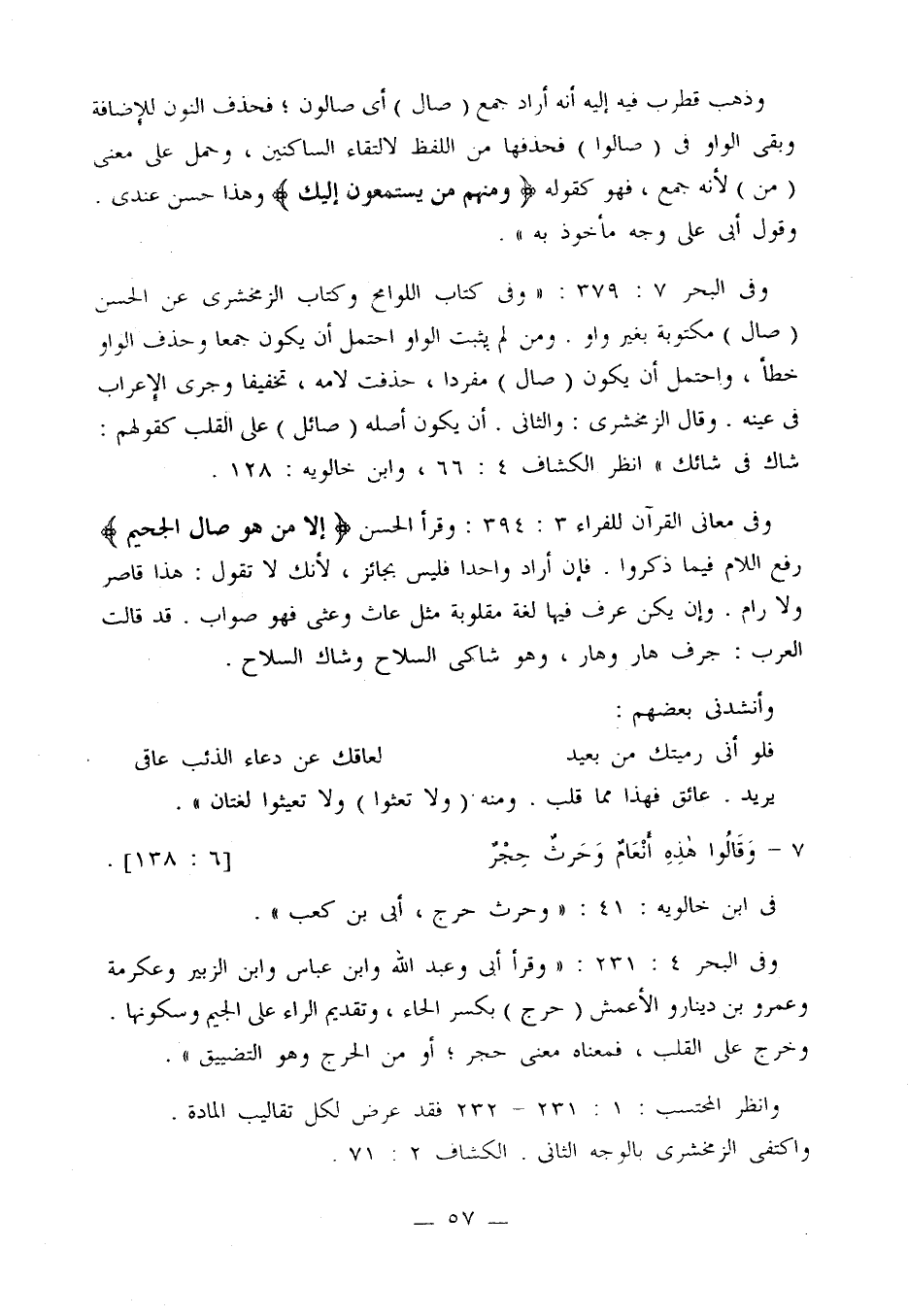 وفي معاني القرآن للفراء 3: 394: وقرأ الحسن {إلا من هو صال الجحيم} رفع اللام فيما ذكروا. فإن أراد واحدًا فليس بجائز، لأنك لا تقول: هذا قاصر ولا رام. وإن يكن عرف فيها لغة مقلوبة مثل عاث وعثى فهو صواب. قد قالت العرب: جرف هار وهار، وهو شاكي السلاح وشاك السلاح.