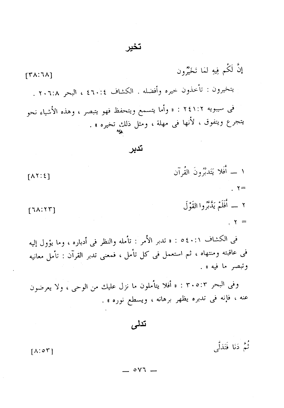 في الكشاف 1: 540: «تدبر الأمر: تأمله والنظر في أدباره، وما يؤول إليه في عاقبته ومنتهاه، ثم استعمل في كل تأمل، فمعنى تدبر القرآن: تأمل معانيه وتبصر ما فيه».