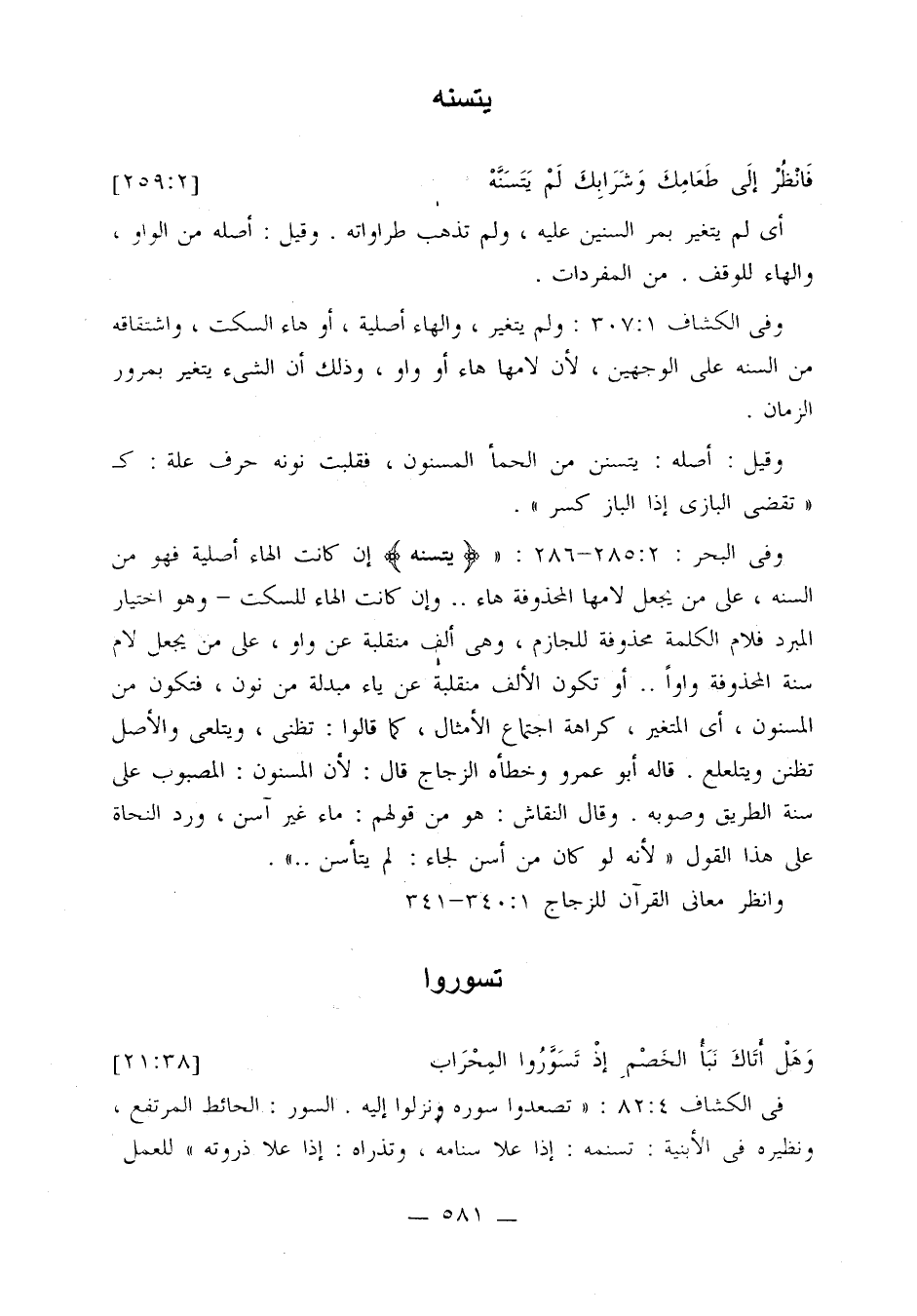 وفي البحر: 2: 285 - 286: «{يتسنه} إن كانت الهاء أصلية فهو من السنه، على من يجعل لامها المحذوفة هاء ... وإن كانت الهاء للسكت - وهو اختيار المبرد فلام الكلمة محذوفة للجازم، وهي ألف منقلبة عن واو، على من يجعل لام سنة المحذوفة واوا ... أو تكون الألف منقلبة عن ياء مبدلة من نون، فتكون من المسنون، أي المتغير، كراهة اجتماع الأمثال، كما قالوا: تظنى، ويتلعى والأصل تظنن ويتلعلع. قاله أبو عمرو وخطأه الزجاج قال: لأن المسنون: المصبوب على سنة الطريق وصوبه. وقال النقاش: هو من قولهم: ماء غير آسن، ورد النحاة على هذا القول لأنه لو كان من أسن لجاء: لم يتأسن ...».