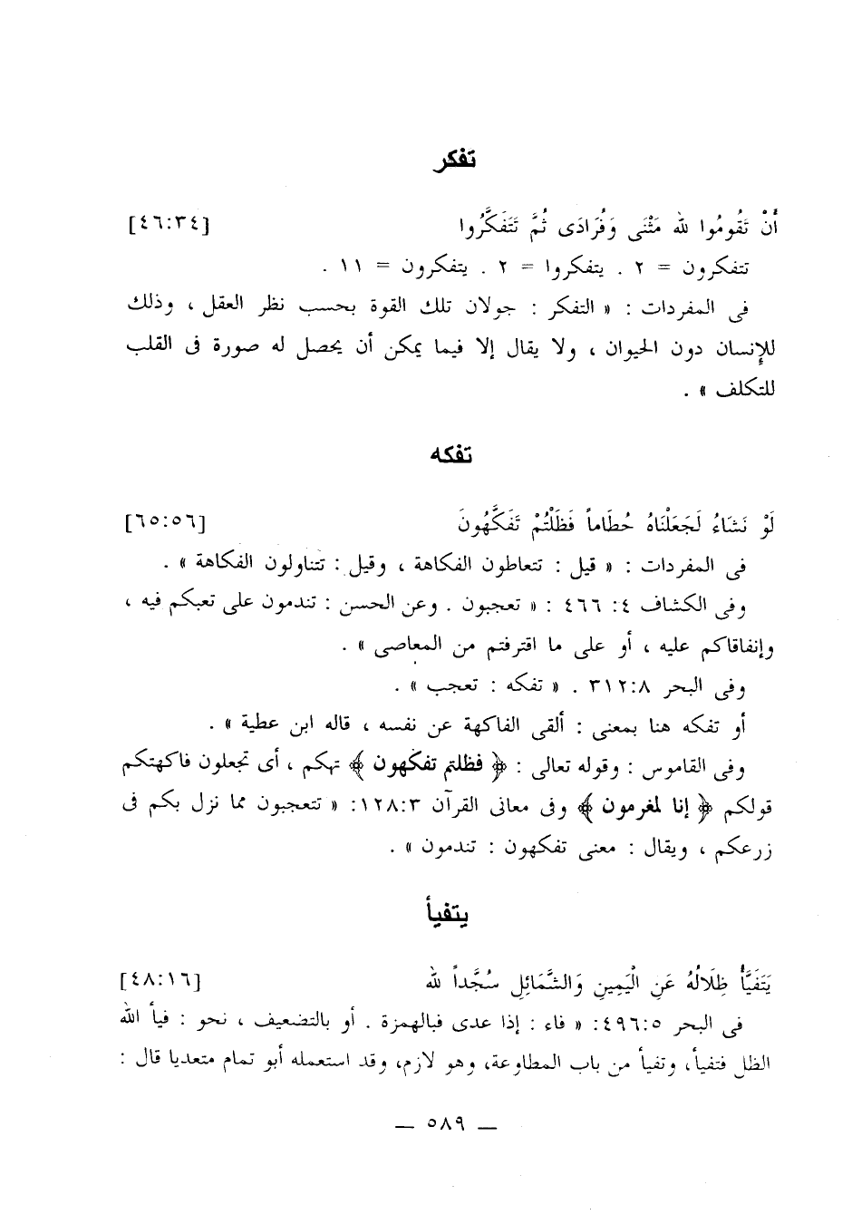 في البحر 5: 496: «فاء: إذا عدى فبالهمزة. أو بالتضعيف، نحو: فيأ الله الظل فتفيأ، وتفيأ من باب المطاوعة، وهو لازم، وقد استعمله أبو تمام متعديا قال: