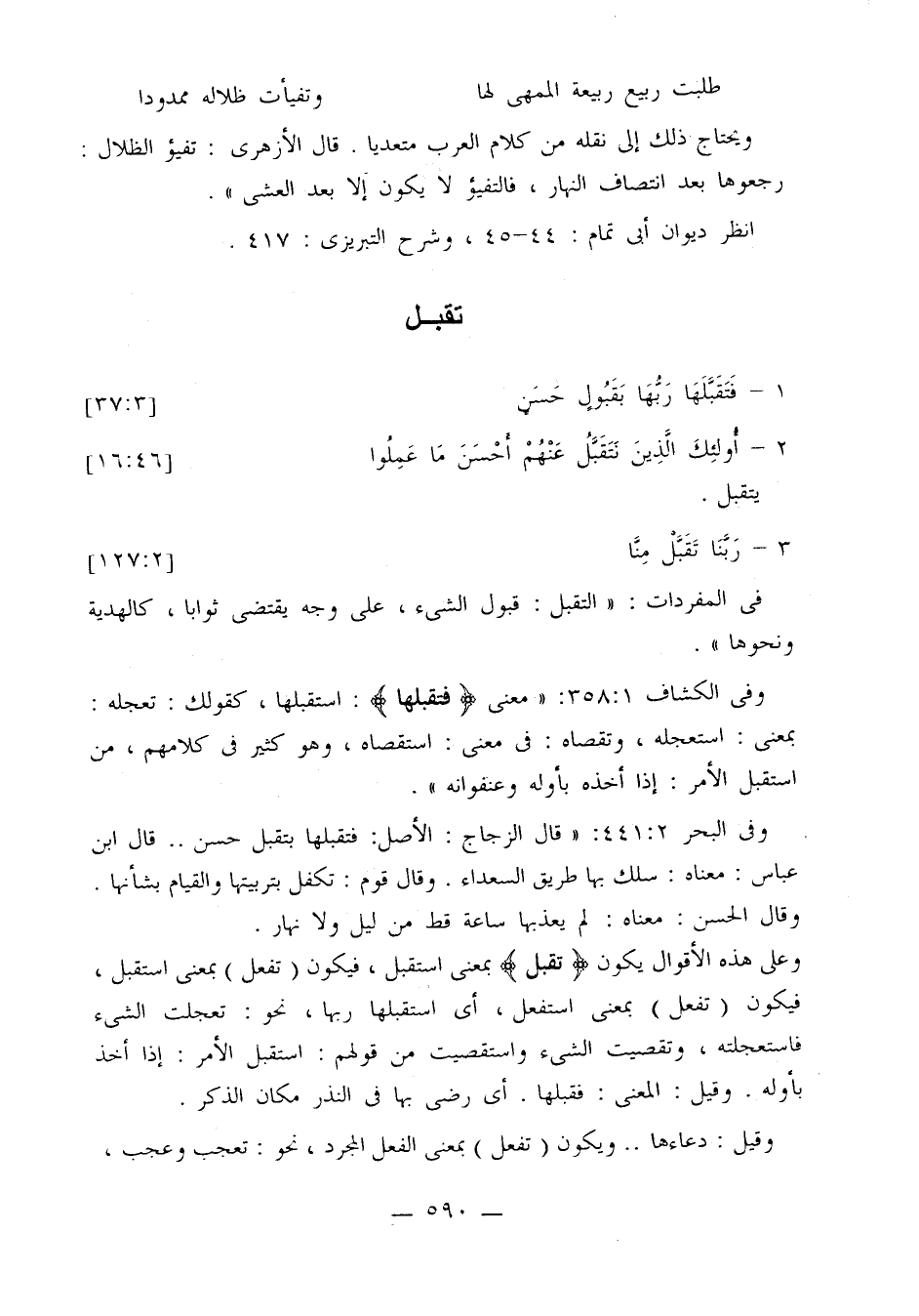 وفي الكشاف 1: 358: «معنى {فتقبلها}: استقبلها، كقولك: تعجله: بمعنى: استعجله، وتقصاه: في معنى: استقصاه، وهو كثير في كلامهم، من استقبل الأمر: إذا أخذه بأوله وعنفوانه».