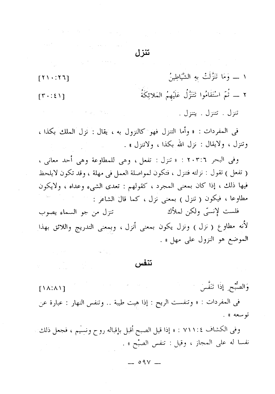 وفي البحر 6: 203: «تنزل: تفعل، وهي للمطاوعة وهي أحد معاني، (تفعل) تقول: نزلته فتنزل، فتكون لمواصلة العمل في مهلة، وقد تكون لا يلحظ فيها ذلك، إذا كان بمعنى المجرد، كقولهم: تعدى الشيء وعداه، ولا يكون مطاوعا، فيكون (تنزل) بمعنى نزل، كما قال الشاعر: