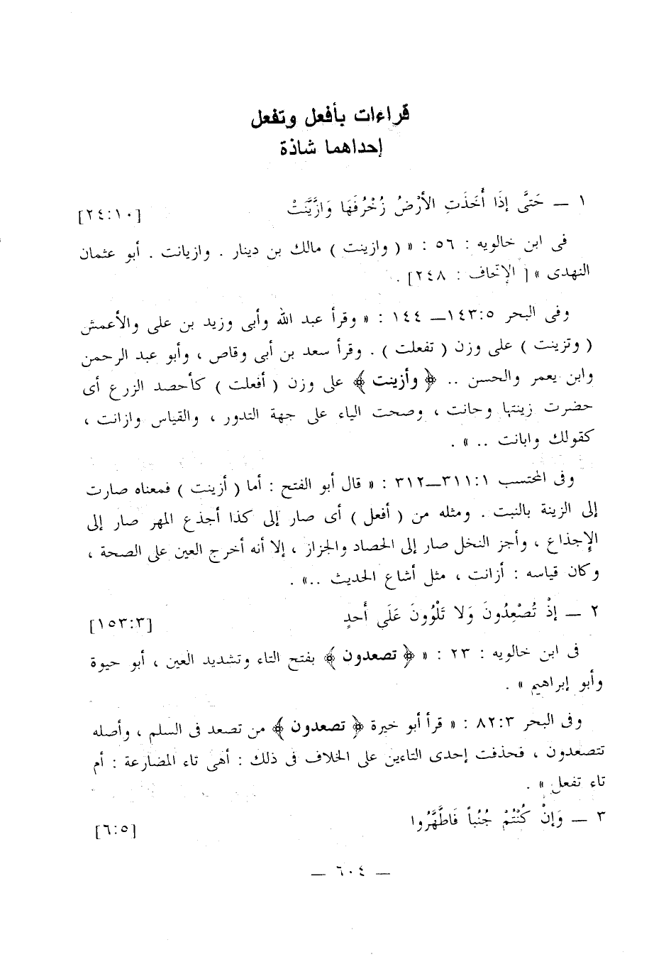 وفي البحر 5: 143 - 144: «وقرأ عبد الله وأبي وزيد بن علي والأعمش (وتزينت) على وزن (تفعلت). وقرأ سعد بن أبي وقاص، وأبو عبد الرحمن وابن يعمر والحسن ... {وأزينت} على وزن (أفعلت) كأحصد الزرع أي حضرت زينتها وحانت، وصحت الياء على جهة التدور، والقياس وازانت، كقولك وابانت ...».