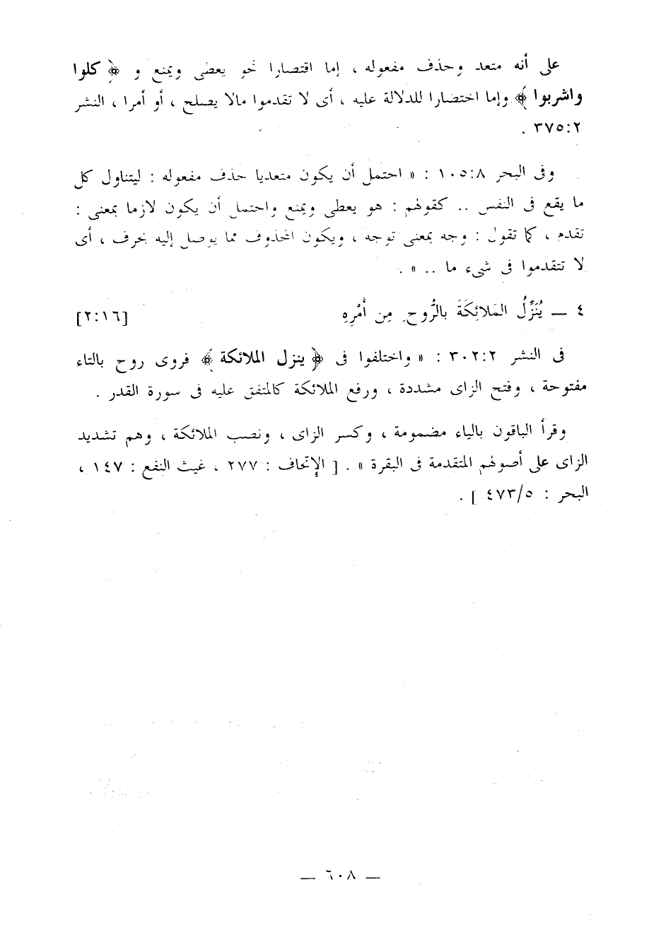في النشر 2: 302: «واختلفوا في {ينزل الملائكة} فروى روح بالتاء مفتوحة، وفتح الزاي مشددة، ورفع الملائكة كالمتفق عليه في سورة القدر.