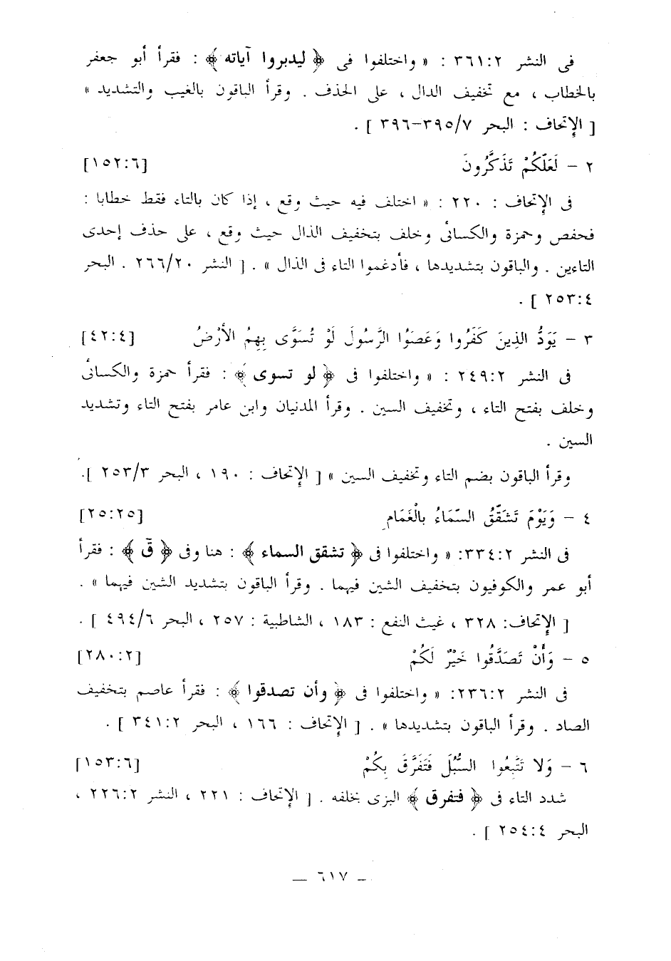 في النشر 2: 361: «واختلفوا في {ليدبروا آياته}: فقرأ أبو جعفر بالخطاب، مع تخفيف الدال، على الحذف. وقرأ الباقون بالغيب والتشديد». الإتحاف: البحر 7/ 395 - 396.