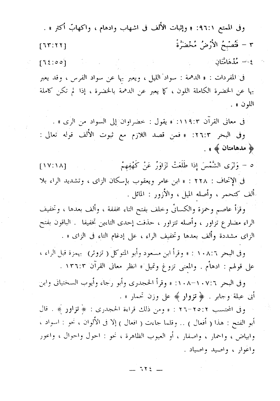 وفي البحر 3: 26: «فمن قصد اللازم مع ثبوت الألف قوله تعالى: {مدهامتان}».