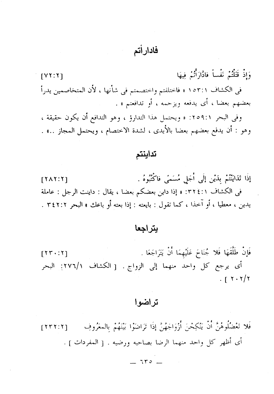 في الكشاف 1: 153: «فاختلفتم واختصمتم في شأنها، لأن المتخاصمين يدرأ بعضهم بعضا، أي يدفعه ويزحمه، أو تدافعتم».