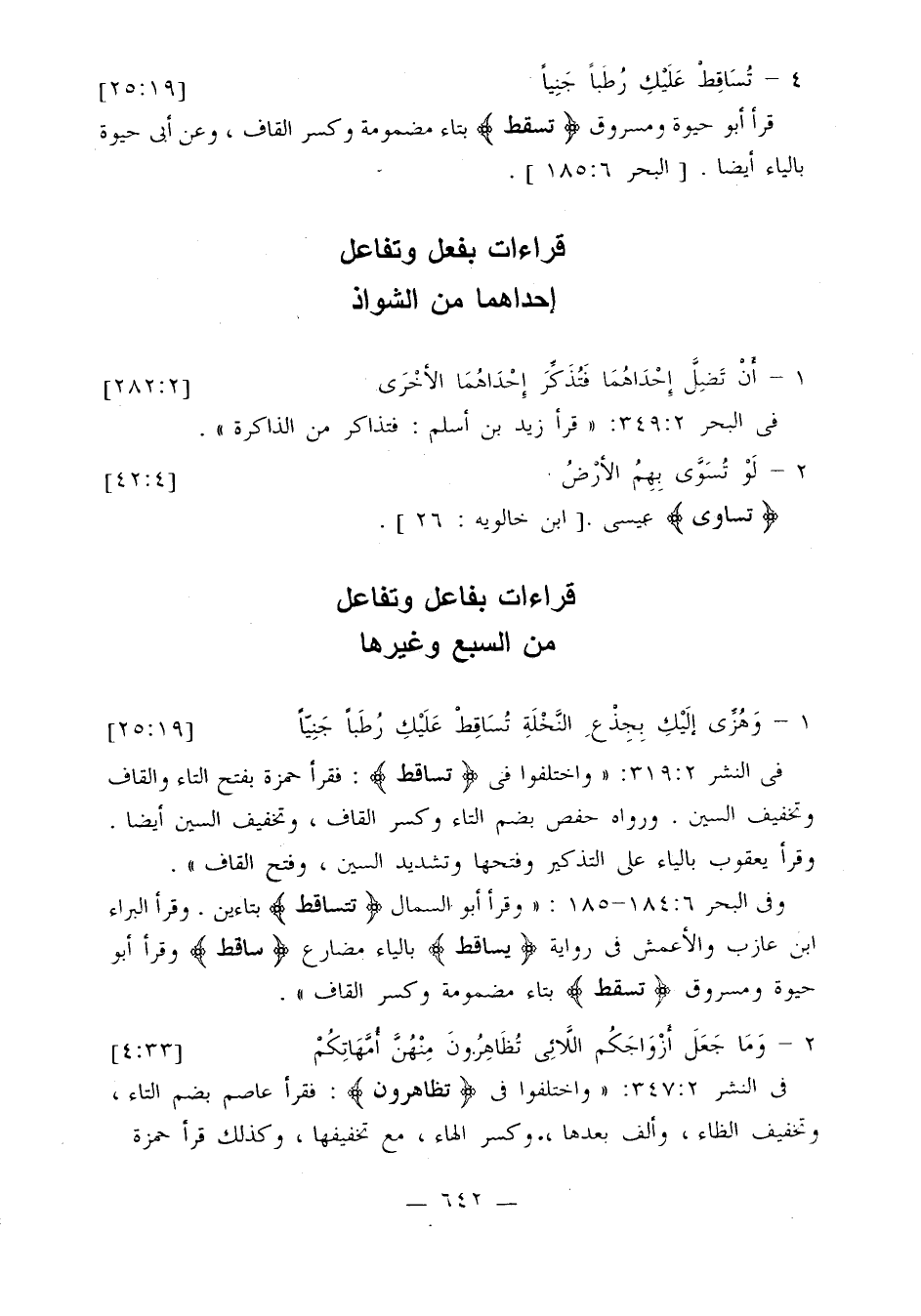 وفي البحر 6: 184 - 185: «وقرأ أبو السمال {تتساقط} بتاءين. وقرأ البراء ابن عازب والأعمش في رواية {يساقط} بالياء مضارع {ساقط} وقرأ أبو حيوة ومسروق {تسقط} بتاء مضمومة وكسر القاف».