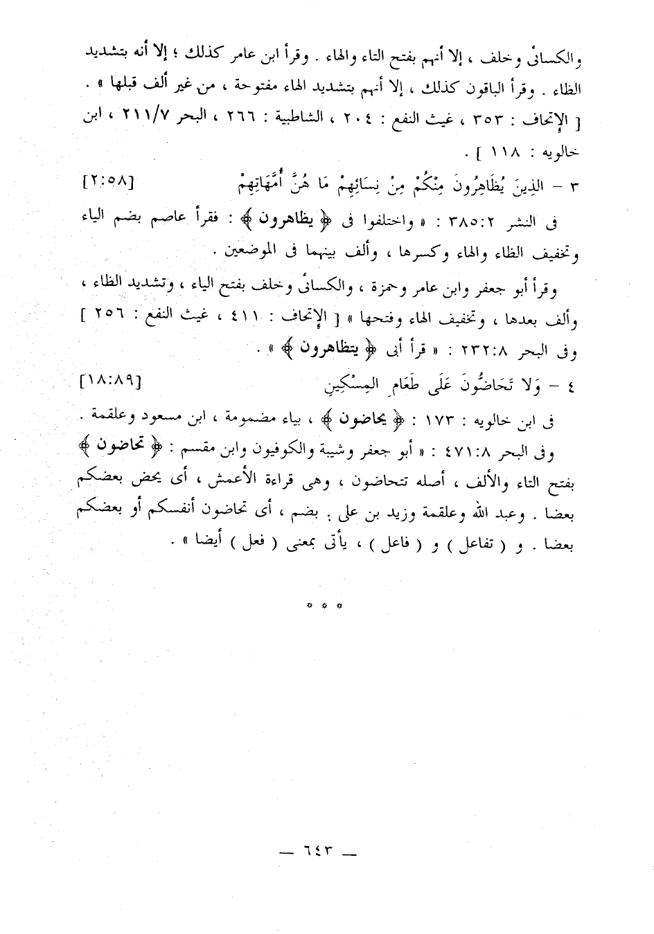 وفي البحر: 471: «أبو جعفر وشيبة والكوفون وابن مقسم: {تخاضون} بفتح التاء والألف، أصله تتحاضون، وهي قراءة الأعمش، أي يحض بعضكم بعضا. وعبد الله وعلقمة وزيد بن علي. بضم، أي تحاضون أنفسكم أو بعضكم بعضا. و (تفاعل) و (فاعل)، يأتي بمعنى (فعل) أيضًا».