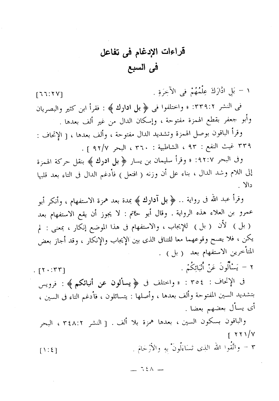 وفي البحر 7: 92: «وقرأ سليمان بن يسار {بل ادرك} بنقل حركة الهمزة إلى اللام وشدد الدال، بناء على أن وزنه (افتعل) فأدغم الدال في التاء بعد قلبها دالاً.