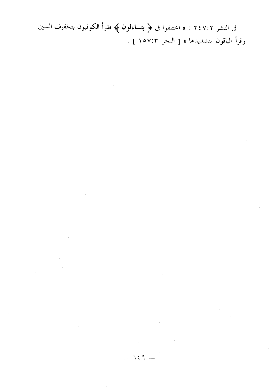 في النشر 2: 247: «اختلفوا في {يتساءلون} فقرأ الكوفيون بتخفيف السين وقرأ الباقون بتشديدها» [البحر 3: 157].