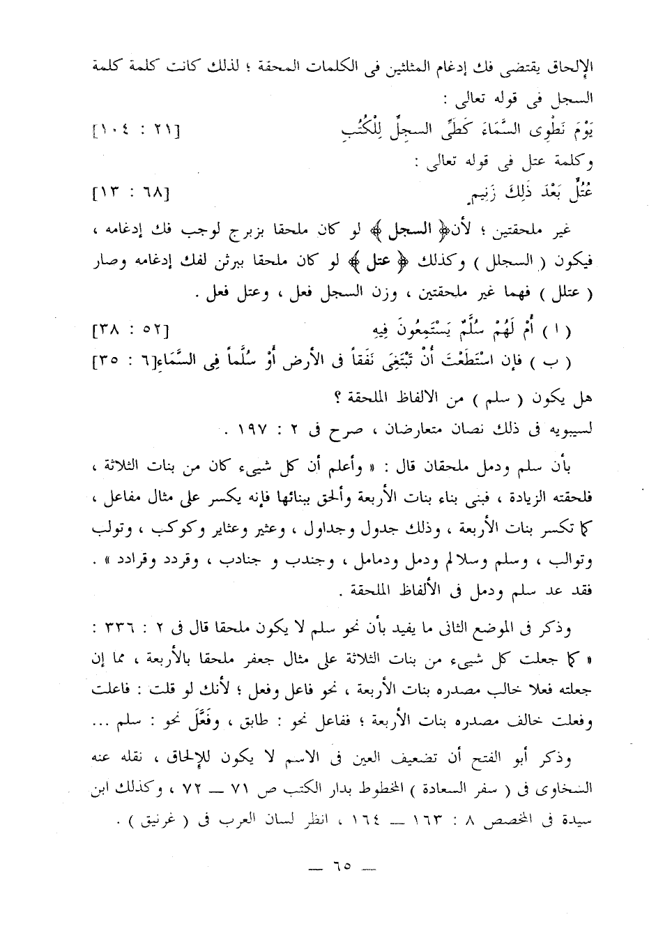وذكر في الموضع الثاني ما يفيد بأن نحو سلم لا يكون ملحقًا قال في 2: 336: «كما جعلت كل شيء من بنات الثلاثة على مثال جعفر ملحقًا بالأربعة، مما إن جعلته فعلاً خالب مصدره بنات الأربعة، نحو فاعل وفعل؛ لأنك لو قلت: فاعتل وفعلت خالف مصدره بنات الأربعة؛ ففاعل نحو: طابق، وفعل نحو: سلم ...
