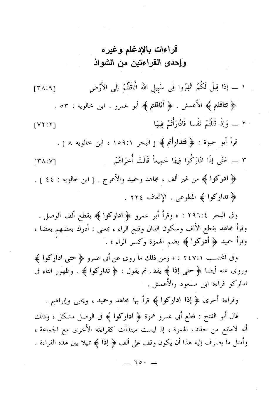 وفي المحتسب 1: 247: «ومن ذلك ما روى عن أبي عمرو {حتى اداركوا} وروى عنه أيضا {حتى إذا} يقف ثم يقول: {تداركوا}. وظهور التاء في تداركوا قراءة ابن مسعود والأعمش».