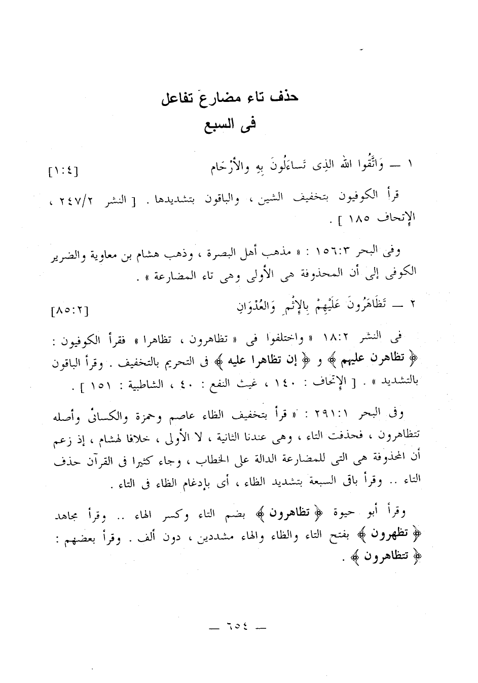 وفي البحر 1: 291: «قرأ بتخفيف الظاء عاصم وحمزة والكسائي وأصله تتظاهرون، فحذفت التاء وهي عندنا الثانية، لا الأولى، خلافا لهشام، إذ زعم أن المحذوفة هي التي للمضارعة الدالة على الخطاب، وجاء كثيرا في القرآن حذف التاء ... وقرأ باقي السبعة بتشديد الظاء، أي بإدغام الظاء في التاء».