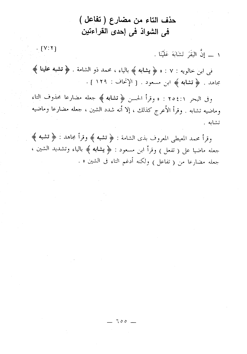 وفي البحر 1: 254: «وقرأ الحسن {تشابه} جعله مضارعا محذوف التاء وماضيه تشابه. وقرأ الأعرج كذلك، إلا أنه شدد الشين، جعله مضارعا وماضيه تشابه.