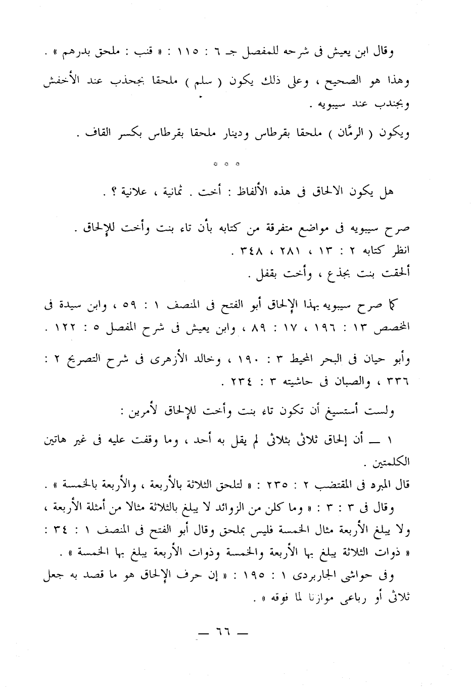 وقال في 3: 3: «وما كلن من الزوائد لا يبلغ بالثلاثة مثالاً من أمثلة الأربعة، ولا يبلغ الأربعة مثال الخمسة فليس بملحق وقال أبو الفتح في المنصف 1: 34: «ذوات الثلاثة يبلغ بها الأربعة والخمسة وذوات الأربعة يبلغ بها الخمسة».