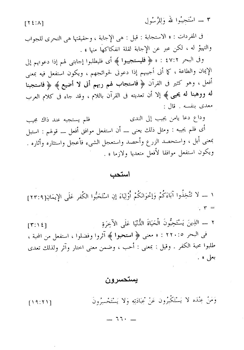 وفي البحر 2: 47: «{فليستجيبوا} أي فليطلبوا إجابتي لهم إذا دعوتهم إلى الإيمان والطاعة، كما أني أجيبهم إذا دعوني لحوائجهم، ويكون استفعل فيه بمعنى أفعل، وهو كثير في القرآن {فاستجاب لهم ربهم أني لا أضيع} {فاستجبنا له ووهبنا له يحيى} إلا أن تعديته في القرآن باللام، وقد جاء في كلام العرب معدي بنفسه. قال: