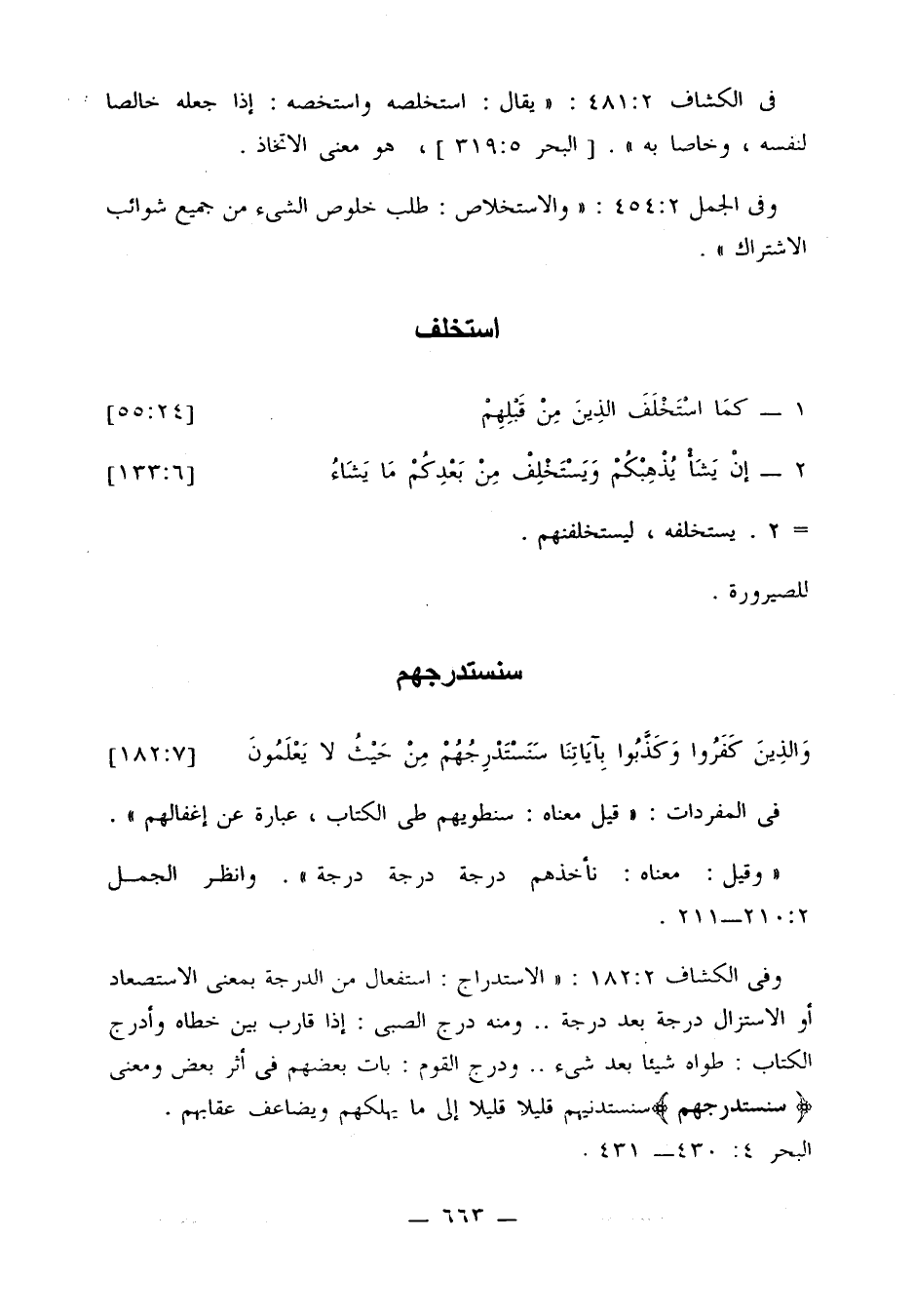 وفي الكشاف 2: 182: «الاستدراج: استفعال من الدرجة بمعنى الاستصعاد أو الاستزال درجة بعد درجة ... ومنه درج الصبى: إذا قارب بين خطاه وأدرج الكتاب: طواه شيئًا بعد شيء ... ودرج القوم: باب بعضهم في أثر بعض ومعنى {سنستدرجهم} سنستدنيهم قليلا قليلا إلى ما يهلكهم ويضاعف عقابهم». البحر 4: 430 - 431.