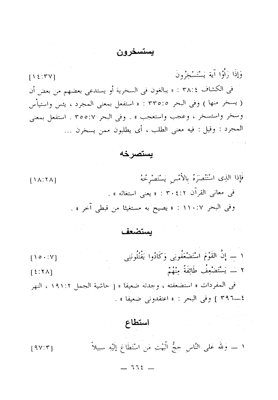 في الكشاف 4: 38: «يبالغون في السخرية أو يستدعى بعضهم من بعض أن (يسخر منها) وفي البحر 5: 335: «استفعل بمعنى المجرد، يئس واستيأس وسخر واستسخر، وعجب واستعجب». وفي البحر 7: 355. استفعل بمعنى المجرد: وقيل: فيه معنى الطلب، أي يطلبون ممن يسخرون ...