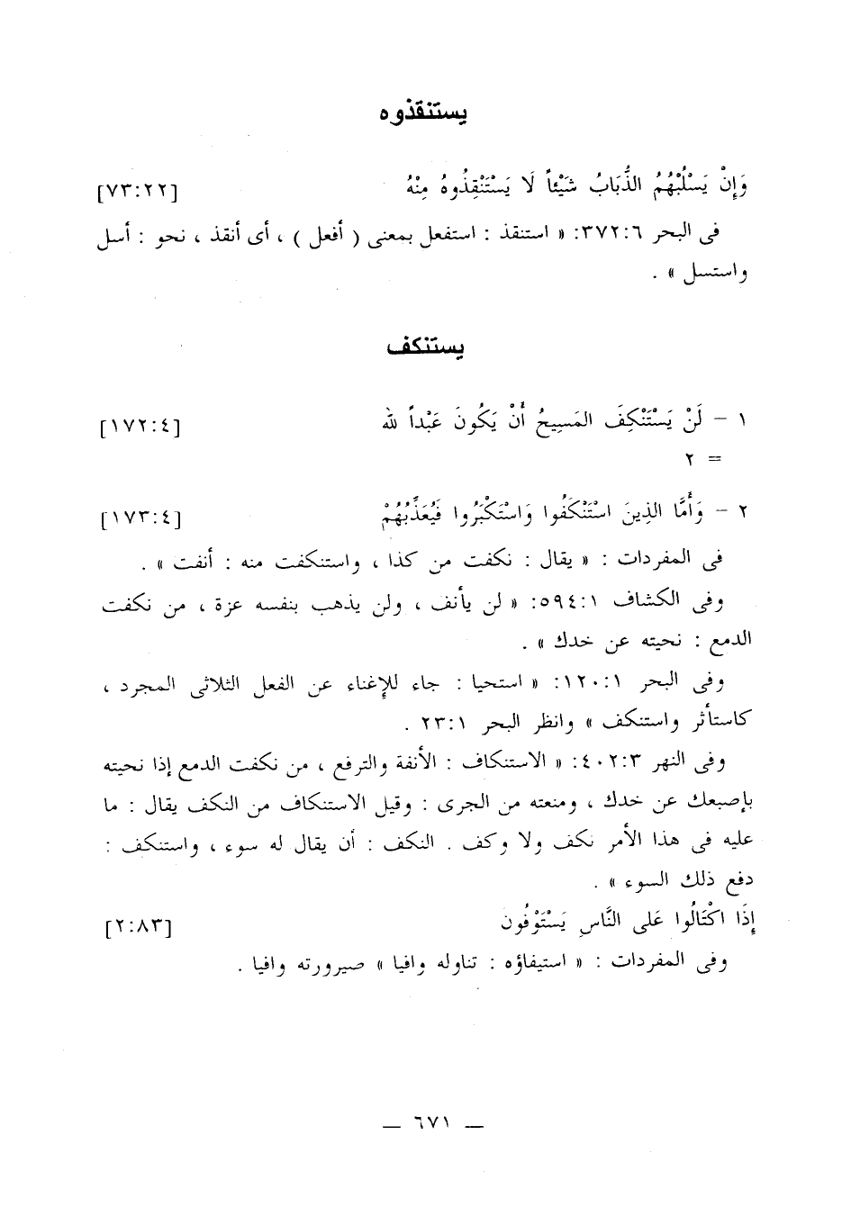 وفي النهر 3: 402: «الاستنكاف: الأنفة والترفع، من نكفت الدمع إذا نحيته بإصبعك عن خدك، ومنعته من الجري: وقيل الاستنكاف من النكف يقال: ما عليه في هذا الأمر نكف ولا كف. النكف: أن يقال له سوء، واستنكف: دفع ذلك السوء».